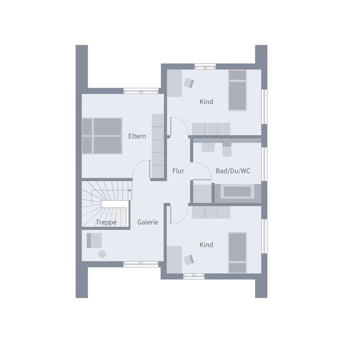 Das Herz dieses Hauses schlägt im offenen Küchen-, Wohn- und Essbereich, in dem Kochen, Genießen und Wohnen fließend ineinander übergehen und dennoch harmonisch gegliedert bleiben. Die Küche schließt praktisch an den Hauswirtschaftsraum an, kurze Wege erleichtern den Alltag. Ein separates Büro im Erdgeschoss bietet Raum für konzentriertes Arbeiten, Gäste-WC und Diele fügen sich unaufdringlich in die Grundrissstruktur ein. Im Dachgeschoss verbinden sich Funktion und Großzügigkeit: Zwei lichtdurchflutete Kinderzimmer, ein Elternschlafzimmer und ein komfortables Bad gruppieren sich um eine ästhetische Galerie, die dem Geschoss Leichtigkeit verleiht und den Blick ins Haus öffnet. Von außen setzt das Haus ein klares architektonisches Statement. Der moderne Silhouettenüberstand sorgt für Tiefe, während Symmetrien und feine Fassadenabsetzungen für visuelle Spannung sorgen. Der überdachte Hauseingang empfängt Bewohner und Gäste gleichermaßen einladend - ein Haus, das innen wie außen mit Anspruch geplant ist.
