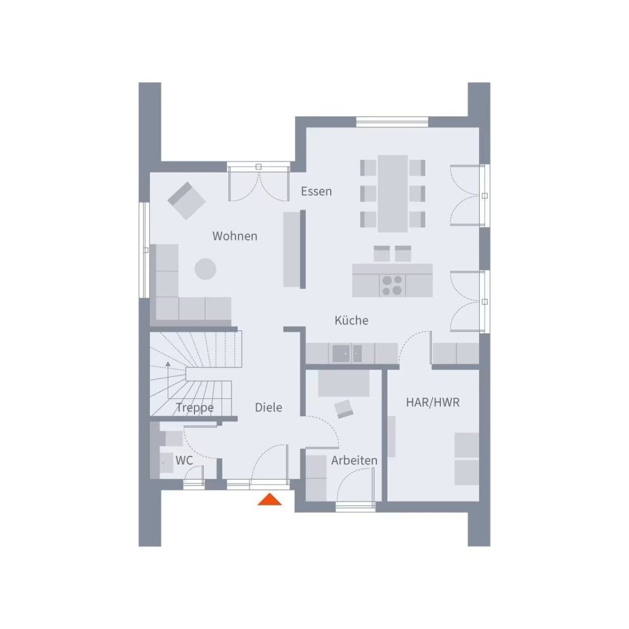 Das Herz dieses Hauses schlägt im offenen Küchen-, Wohn- und Essbereich, in dem Kochen, Genießen und Wohnen fließend ineinander übergehen und dennoch harmonisch gegliedert bleiben. Die Küche schließt praktisch an den Hauswirtschaftsraum an, kurze Wege erleichtern den Alltag. Ein separates Büro im Erdgeschoss bietet Raum für konzentriertes Arbeiten, Gäste-WC und Diele fügen sich unaufdringlich in die Grundrissstruktur ein. Im Dachgeschoss verbinden sich Funktion und Großzügigkeit: Zwei lichtdurchflutete Kinderzimmer, ein Elternschlafzimmer und ein komfortables Bad gruppieren sich um eine ästhetische Galerie, die dem Geschoss Leichtigkeit verleiht und den Blick ins Haus öffnet. Von außen setzt das Haus ein klares architektonisches Statement. Der moderne Silhouettenüberstand sorgt für Tiefe, während Symmetrien und feine Fassadenabsetzungen für visuelle Spannung sorgen. Der überdachte Hauseingang empfängt Bewohner und Gäste gleichermaßen einladend - ein Haus, das innen wie außen mit Anspruch geplant ist.