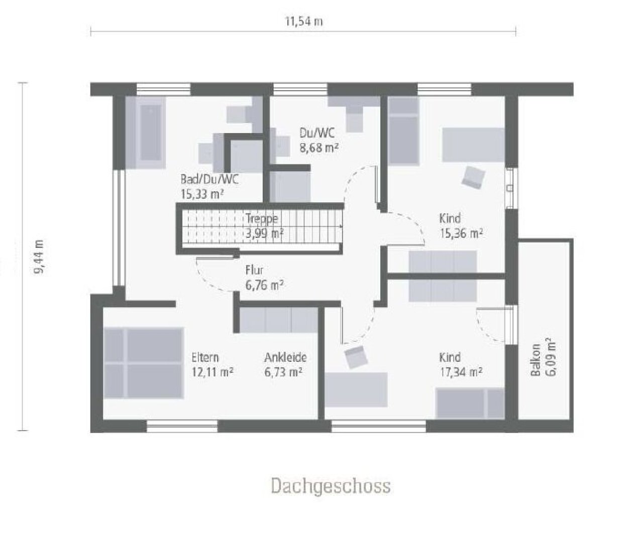 Klassisch und stilvoll präsentiert sich das 2-geschossige Einfamilienhaus Design 13. Unter dem Satteldach vereinen sich moderne Architektur und höchster Wohnkomfort. Im Entrée trennt die offene Treppe WC und HWR räumlich vom restlichen Wohnbereich ab. Auch das Büro findet hier seinen Platz. Der offene und helle Koch- und Wohnbereich wird durch ein freistehendes Wandelement gekonnt unterbrochen. Vom Wohn- und Esszimmer geht es zur großflächigen Eckterrasse. Im Obergeschoss ist die Elternsuite mit Bad und Ankleide dank kluger Raumaufteilung geschickt von den Kinderzimmern mit eigenem Dusch-WC abgegrenzt. Der Dachvorsprung an der Giebelseite setzt nicht nur gestalterische Akzente, sondern sorgt auch für einen geschützten Aufenthalt im Freien.